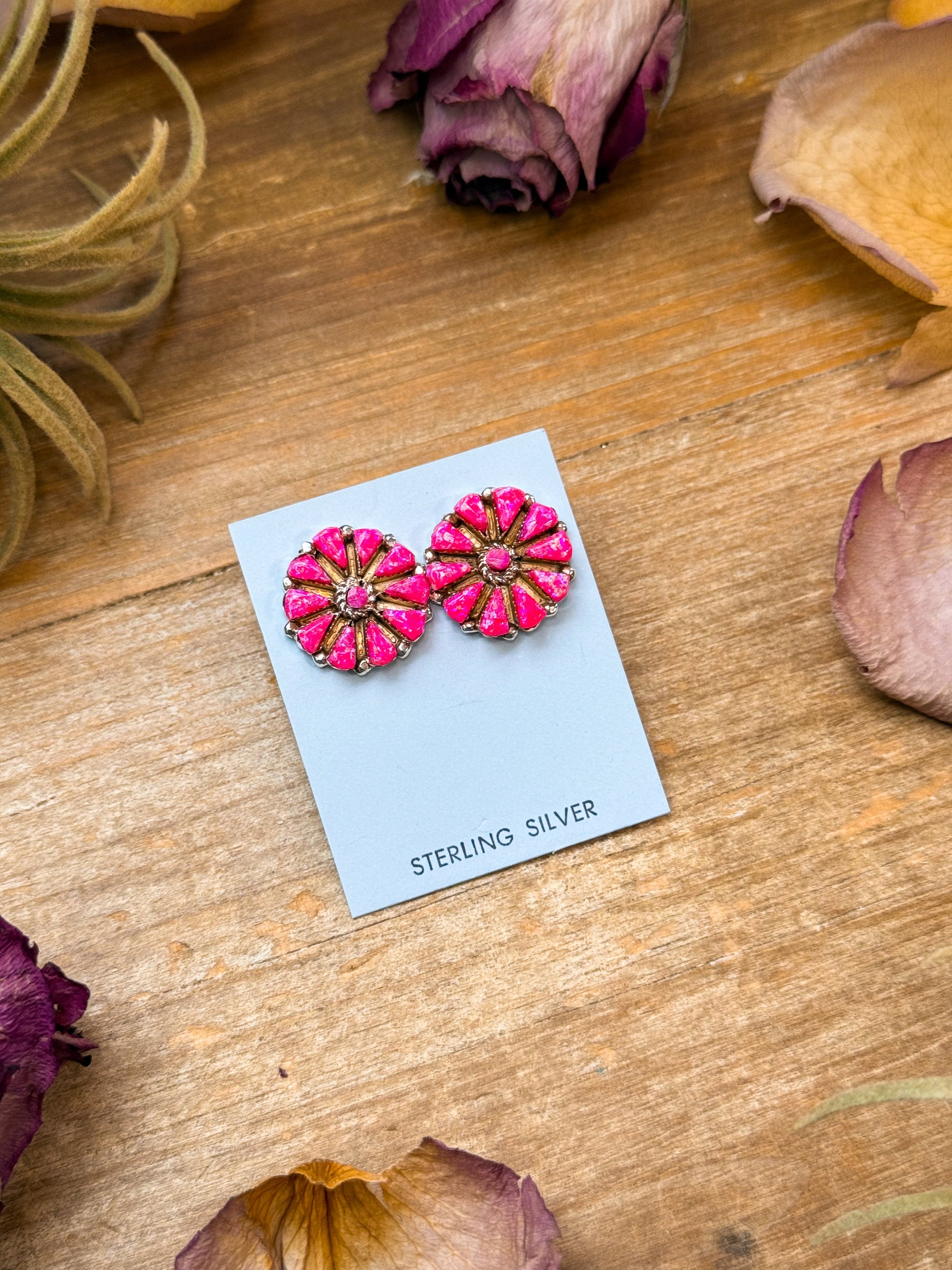 These pink opal cluster earrings are Native made and beautifully handcrafted in sterling silver by artist S.C. Each pair is stamped “S.C.” and “Sterling,” featuring soft pink opal stones arranged in a classic cluster design. The post-in-the-middle setting offers a balanced and comfortable fit. Every pair is unique in color and pattern, making these earrings a one-of-a-kind expression of Southwestern elegance.